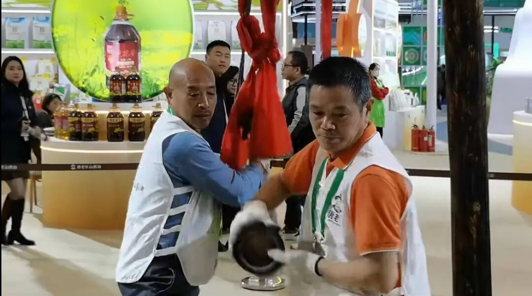 循着浓浓的茶油香和木头的撞击声,记者来到一个“古法木榨油”现场,这里围满观展的大人与小孩。